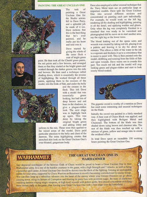 Never truly great, Dave’s painting was, I suppose, sufficient. He had a few inspired moments from which came a handful of noteworthy pieces at best. He was certainly not the best, as amply demonstrated by many of his contemporaries, although Dave did play some small part in the rearing of other talent. No, his claim to fame (apart from taking five weeks to paint one Greater Daemon of Nurgle) was that, along with a few others such as Paul Muller, Stuart Thomas and Mark Jones, he was a guardian of the old lore, protector of tradition and resistance fighter. Or at least that’s what he liked to think.